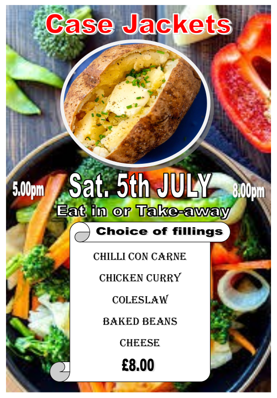 On Saturday 5 July our very own Case Catering Team will be offering freshly prepared jacket potatoes with a choice of fillings, including a vegetarian alternative, all for £8. Eat in the pub or take-away. Service will be from 5pm to 8pm. Families welcome.