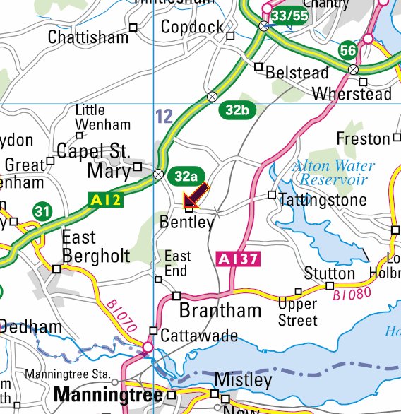 We are here: The Case is Altered, Capel Road, Bentley, Ipswich, IP9 2DW. That’s around 7 miles South of Ipswich town centre, see the arrow in the map below.