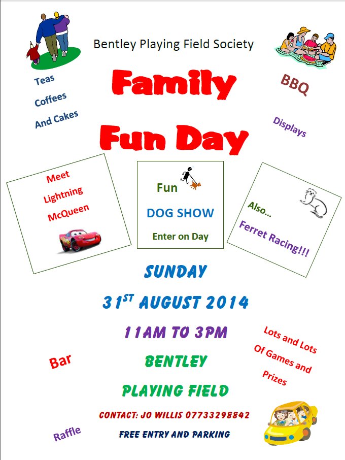 This coming weekend’s big event is the Family Fun Day, run by the Bentley Playing Field Society. Come and join the fun: Sunday 31st, 11-3! Dave Telling’s running a bar on the field, David Westley has his ferret racing, Nicky’s running a kids’ archaeology pitch, LOADS more to see and do! The pub is open from 12-6 too..