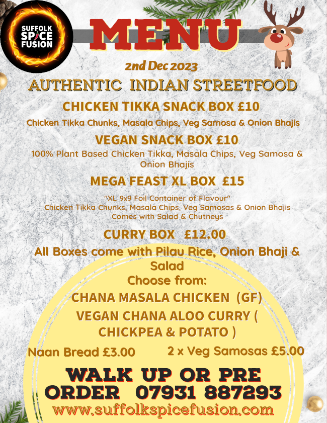 On Saturday 2nd December we will again be welcoming mobile food vendor Suffolk Spice Fusion to the Case. They are a local authentic Indian street food business and will be serving their delicious flavours of Northern India from their kiosk in the pub car park between 5.00pm & 8.00pm. Come early and get a take-away or, as the pub will be open from 6pm, come after 6 and eat your food in the pub whilst enjoying a drink. Families welcome. Pre-orders are preferred but walk-ups accepted.