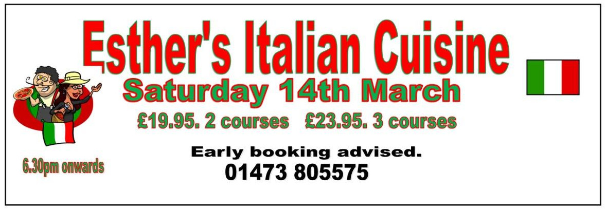 Our next special food event will be held on Saturday 14th March. Our visiting chef Esther will be cooking a delicious Italian themed meal from 6.30pm.