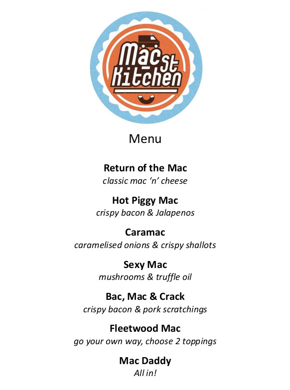 Pre-orders are not necessary unless you have dietary requirements. Pre-order Gluten and Dairy free via Facebook or email to macstreetkitchen@gmail.com.Mac Street Menu