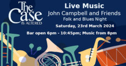 On Saturday 23rd March we will be holding another music event with one of our regular Open Mic Night contributors, John Campbell, for an entertaining evening of great folk and blues music. John will be joined by a couple of friends, Graham and Mark Kemp. Music will start soon after 8pm once food from earlier […]